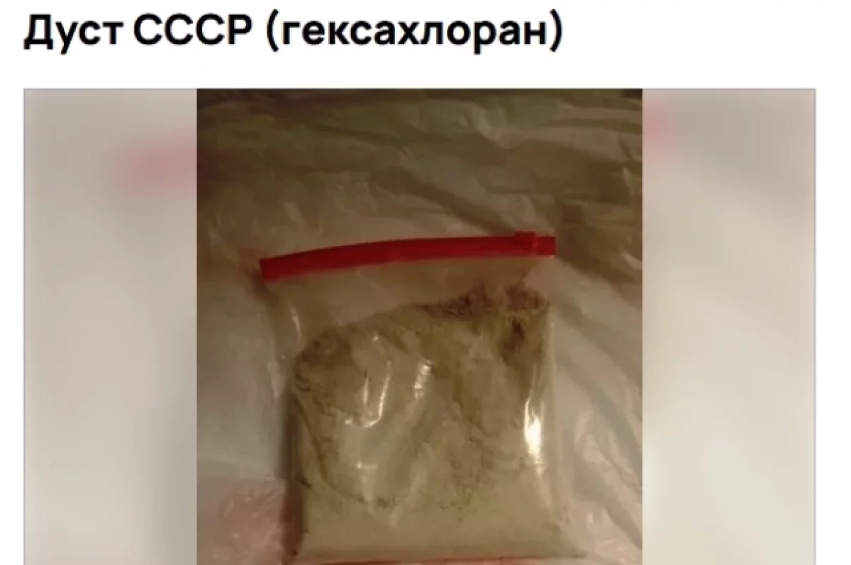 Речь идёт о гексохлоране (дусте), произведённом ещё в СССР. Оборот этого препарата на территории Российской Федерации сейчас запрещён, поскольку он не имеет государственной регистрации. Использование таких веществ угрожает здоровью людей (отравления, хронические заболевания, аллергия), опасно для животных и экосистемы (токсины накапливаются в почве и воде), а также может привести к снижению урожайности и порче сельхозпродукции.