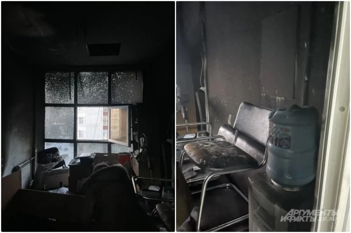 Журналист omsk.aif.ru оказался на месте. По фото видно, что офис выгорел полностью, полопались стёкла, оплавился пол и почернели окна. Во всём здании нет света, на месте работают сотрудники МЧС России по Омской области.