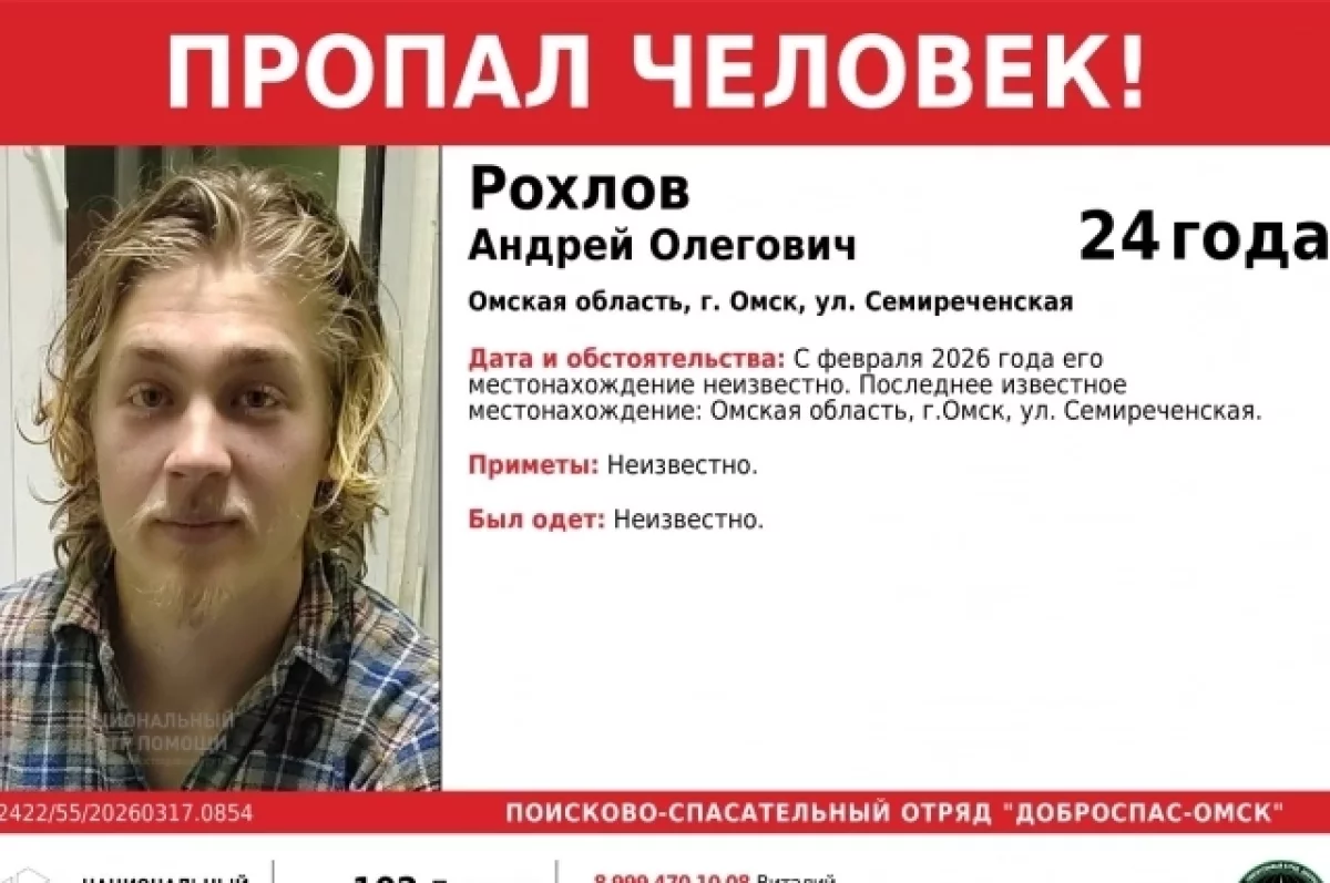 В Омске разыскивают 24-летнего Андрея Рохлова. Местонахождение молодого человека неизвестно с февраля 2026 года, сообщили волонтеры «Доброспаса».
