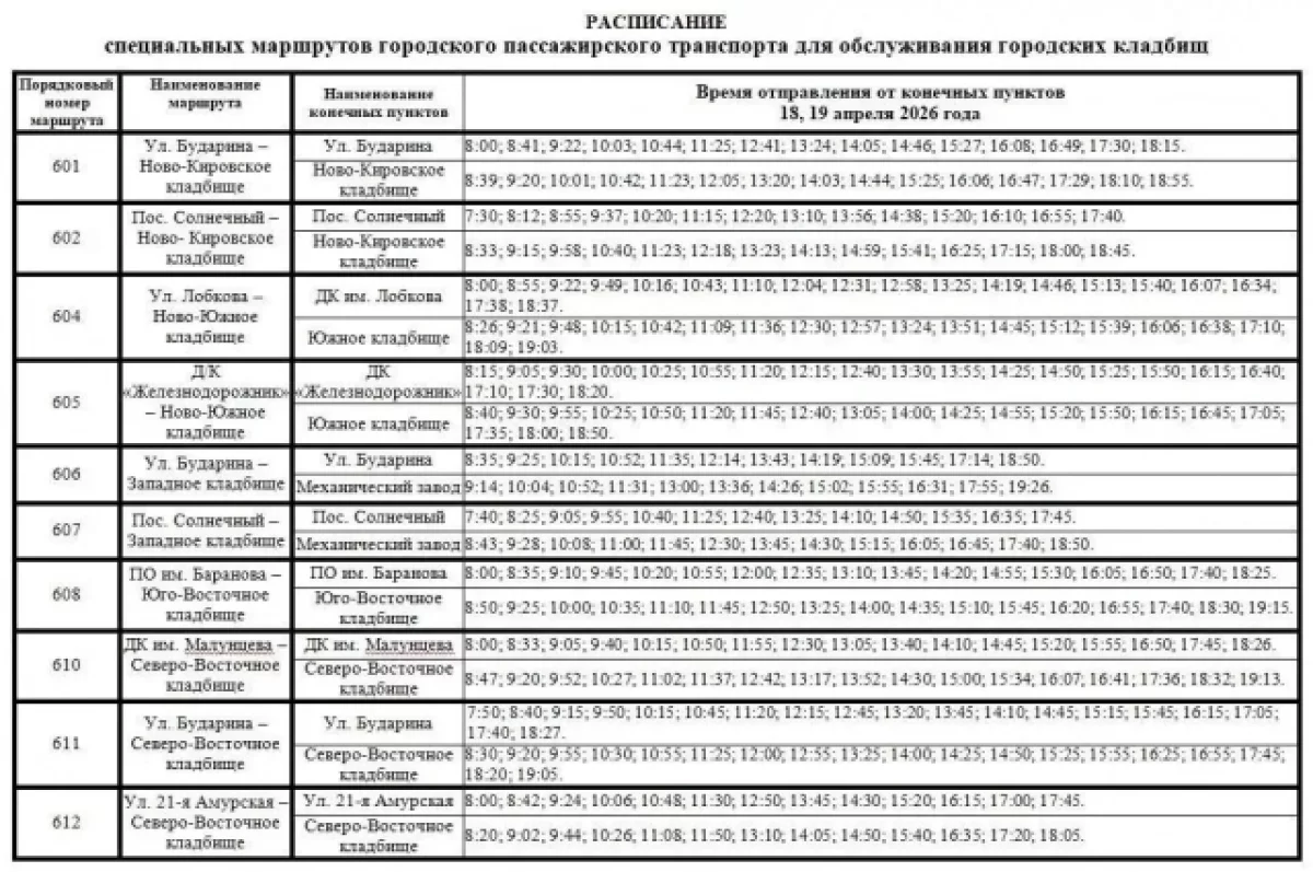 18 и 19 апреля спецавтобусы будут ходить с 8 утра до 7 вечера по расписанию. 21 апреля — с 8 до 8 вечера, отправление по мере наполнения салона. Список маршрутов опубликован: до Ново-Кировского кладбища можно доехать на № 601 и 602, до Ново-Южного — на № 603, 604 и 605, до Западного — на № 606 и 607, до Юго-Восточного — на № 608 и 609, до Северо-Восточного — на № 610, 611 и 612, до Черемуховского — на № 613.