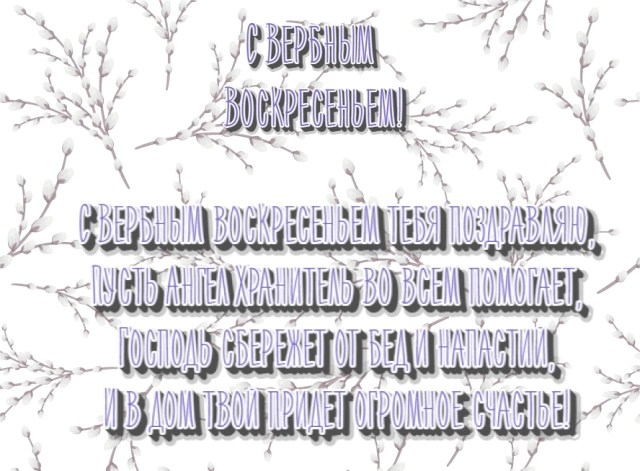 - «Поздравляю со светлым весенним праздником — Вербным воскресеньем! Пусть все плохое останется позади, а впереди будет солнце, радость и счастье! Пусть вербная ветвь принесёт вам здоровье, долголетие и благополучие!»
